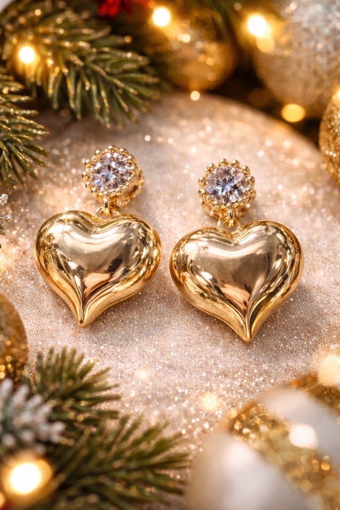 Parlak altın renkli, iri kalp şeklinde kısa uzunlukta küpeler, payetli detaylar ve ışıltılı taş üstü ile romantik akşamlar için uygun.
