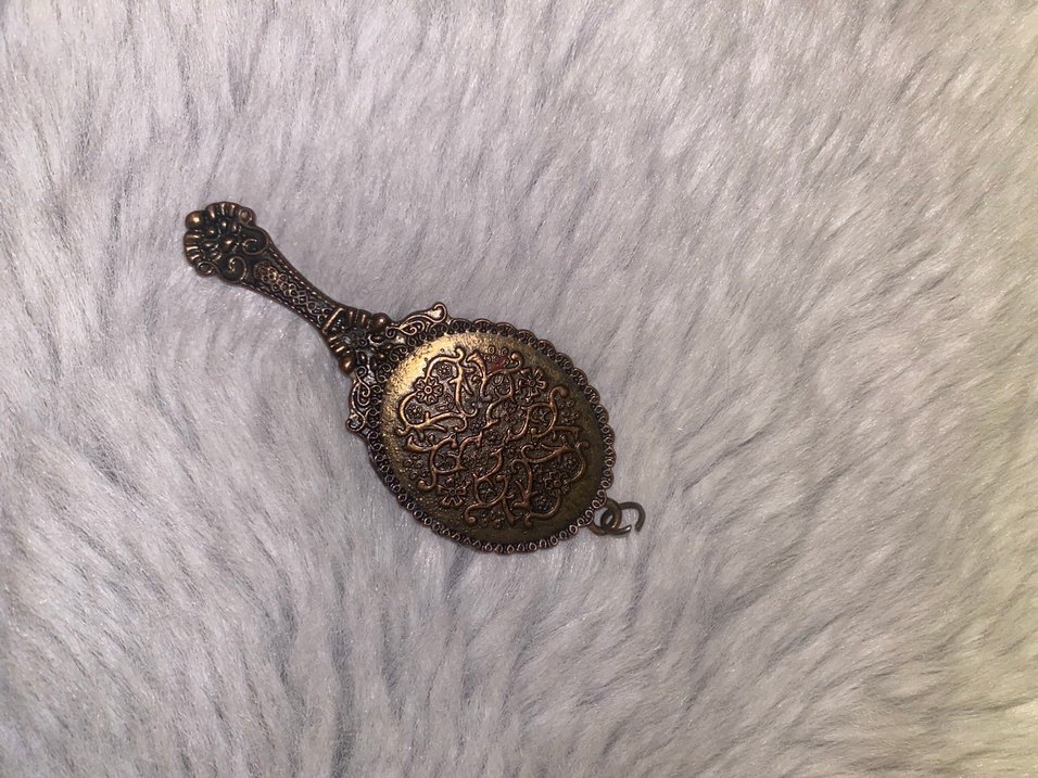 Parlak altın renkli, işlemeli ve püsküllü vintage tarzda broş, günlük kullanıma uygundur.