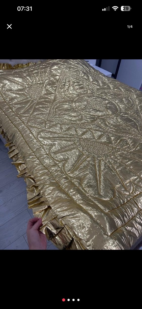 Parlak altın renkli yatak örtüsü, işlemeli desenleri ve fırfırlı kenarıyla yatak odanıza şıklık ve doku katıyor. ✨ hıc kullanılmadı ceyizliktir ozel yapıldı marka temsilidir