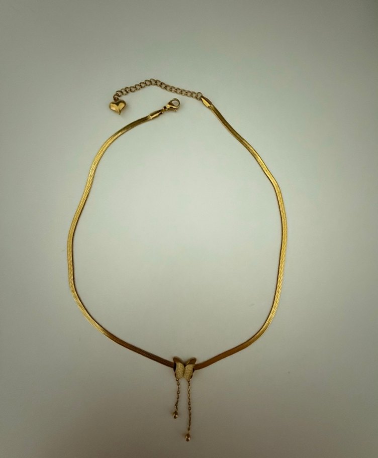 Altın renginde, italyan zincir detaylı ve kelebek deseni bulunan uzunlukta kolye. Günlük sokak stiline uygun, cesur ve minimalist tasarım. ✨