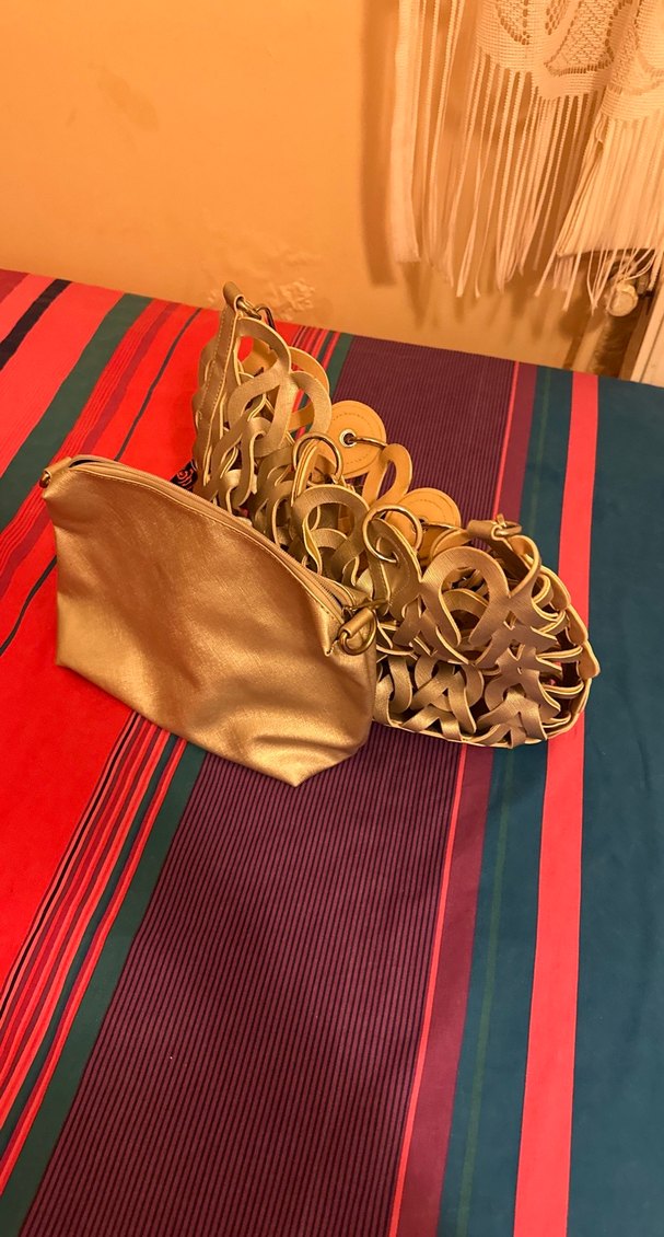 Altın renk deri clutch çanta, renkli nakışlı desen ve tokalı detaylarla, parti için avant-garde tarzına uygun.