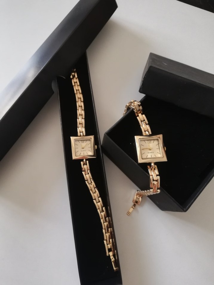 Parlak altın renkli kemerli kadın saati, vintage cazibeyi modern klasik tarzla birleştirir. Kare kadran benzersiz bir dokunuş sağlar. ⌚
