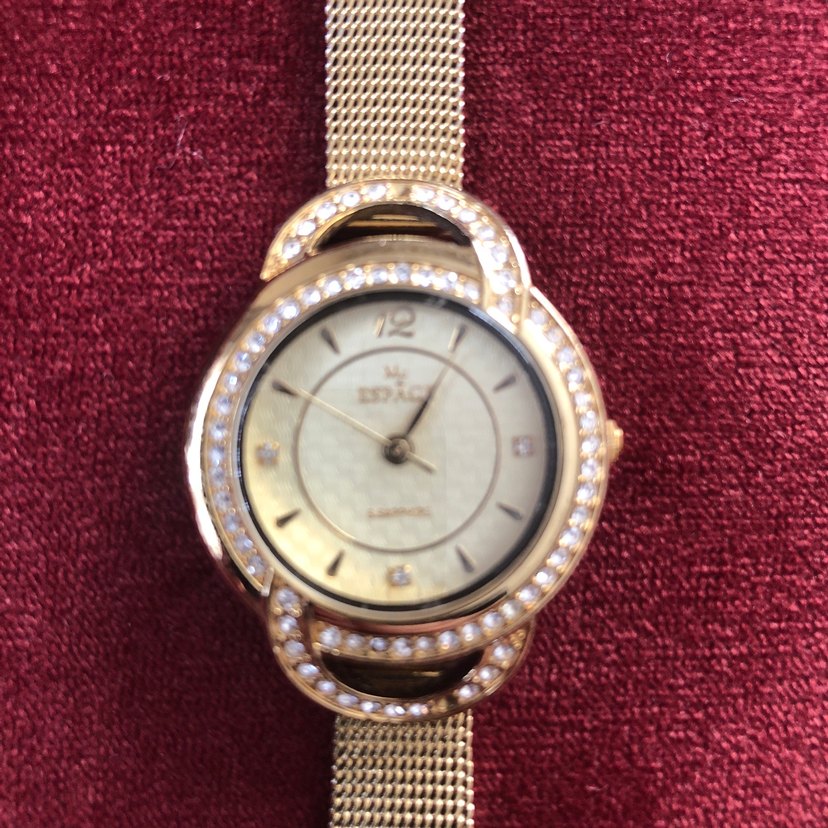 Parlak taşlarla çevrili yuvarlak kadran ve altın renkli kemerli tasarıma sahip kadın kol saati, klasik ve modern tarzı bir araya getirir.