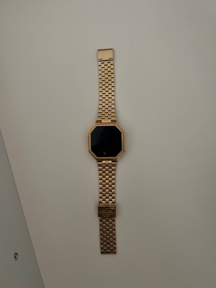 Altın renkli, tokalı metal kayışa ve minimalist kare kadrana sahip, koyu ekranlı kadın saati. ⌚
