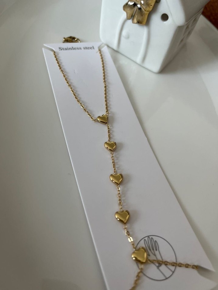 Paslanmaz çelikten, parlak kalp detaylı altın renk kadın el zinciri. Bohem ve minimal tarzlara uygun, günlük kullanım için ideal.