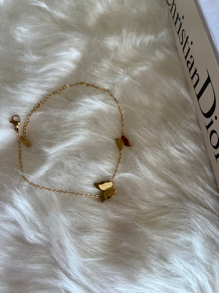 Altın renkli, zincir detaylı ve minimal kelebek figürlü kadın bilekliği, günlük kullanıma uygundur. Ürünlerimiz altın kaplamadır. Ürünlerimiz kararma ve solmaya dayanıklıdır. Ürünlerimiz altın kaplama olduğu için alerji yapmamaktadır.