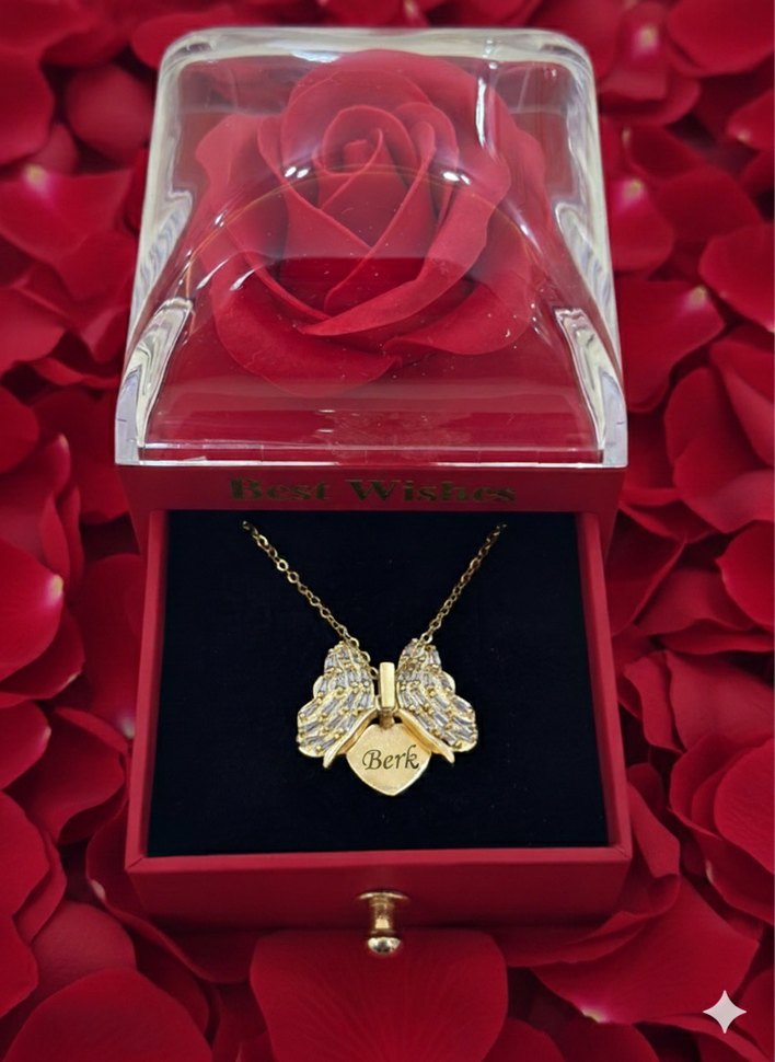 Kelebek kolyenin orta kısmına dilegin isim veya harf yazılabilir altın renkli, payet detaylı kelebek kolye. Gösterişli ve cesur tarz için ideal, romantik gül kutusunda sunulur. Hediye paketi ve notu ile teslim edilir