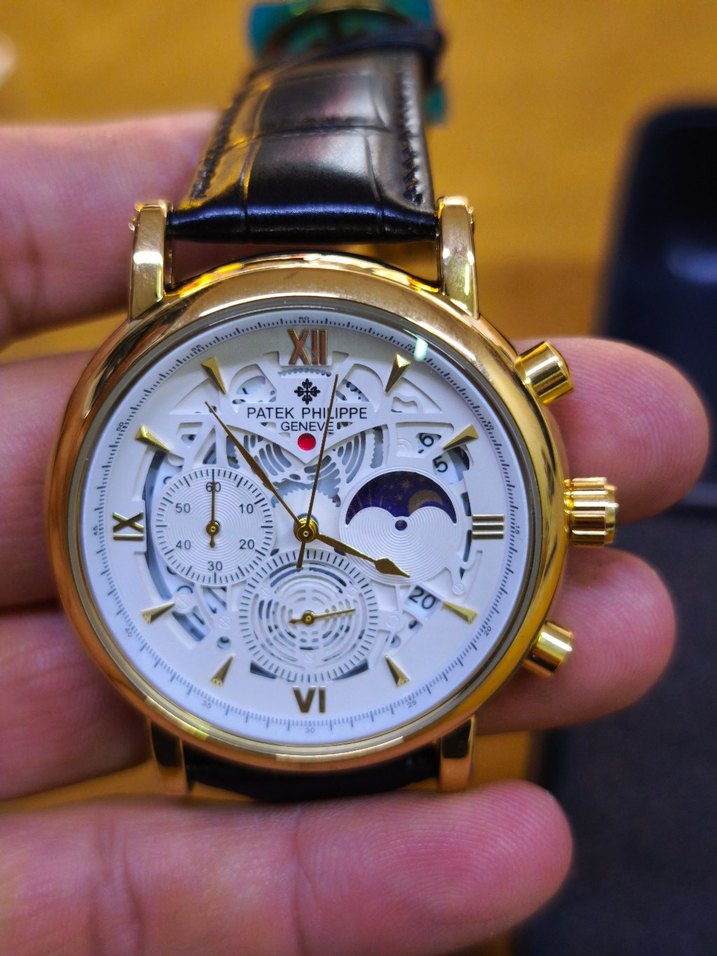Altın renk kasa ve koyu deri kayışlı modern klasik erkek kol saati. Beyaz kadranda Roma rakamları, alt kadranlar ve ay fazı göstergesi bulunur. ⌚