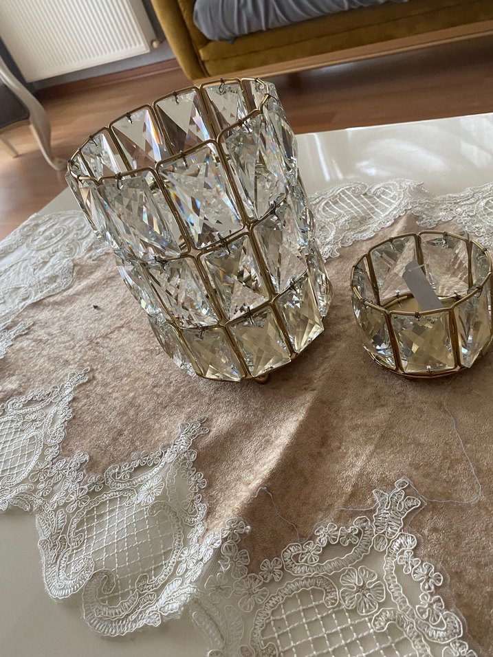 Altın renkli metal çerçeve ve şeffaf kristal detaylarla dekoratif mumluklar, ortama parlaklık katıyor. ️
