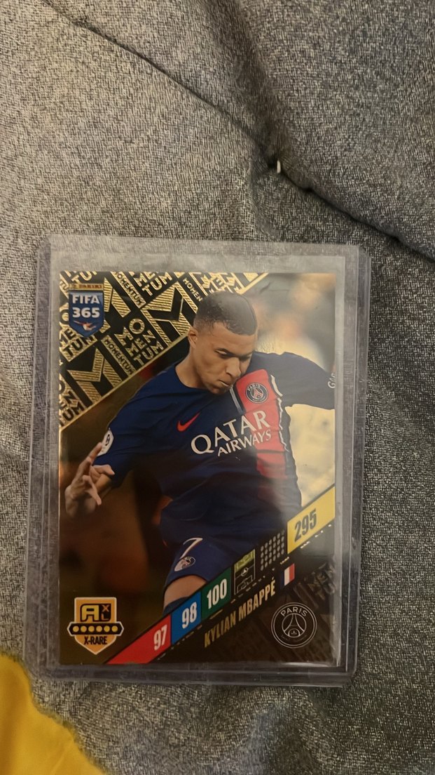 Kylian Mbappé'nin Paris Saint-Germain formasıyla yer aldığı, altın vurgulu koyu renkli pop kültür kartı. FIFA 365 ve istatistik bilgileri içerir. ⚽