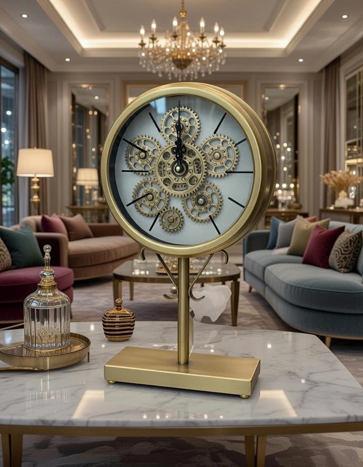Altın renkli masa saati, görünür dişliler ve yuvarlak çerçeveye sahiptir. Dikdörtgen taban üzerinde durur, mekanik bir hava katar. ⏰