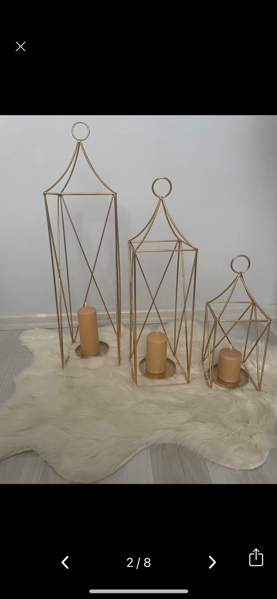 Geometrik tasarımlı, üç boyutta altın renk metal mumluklar. Göründüğü gibidir mumlar dahıl değil