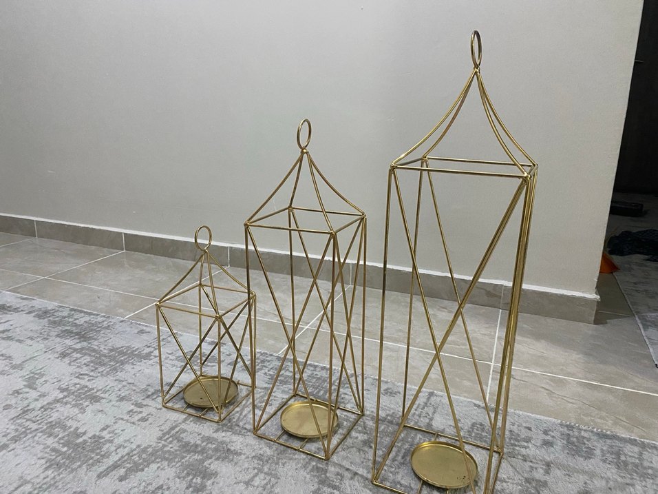 Geometrik tasarımlı, üstte halka bulunan üç adet açık altın renkli metal mumluk seti. Taşıması ve asması kolay.