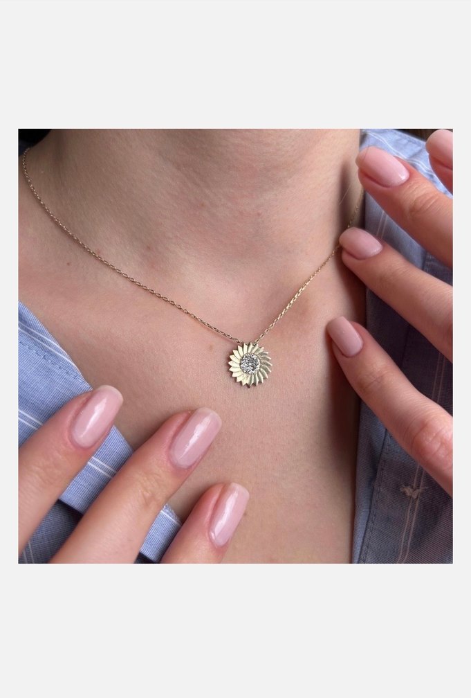 Altın renk mini uzunlukta, çiçek desenli detaylı zincir kolye, günlük kullanıma uygun minimal ve çağdaş tarzda.