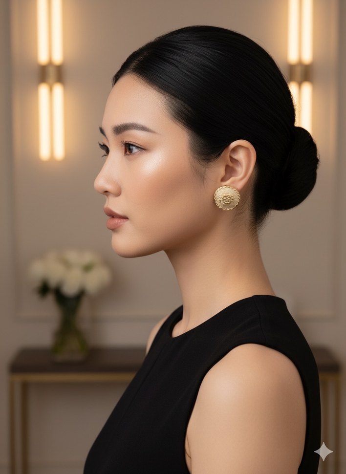 Parlak altın renkli mini küpeler, etnik desenli ve kısa boyda olup düğünlerde zarif şıklık sunar. Klasik tarz için uygundur. ✨