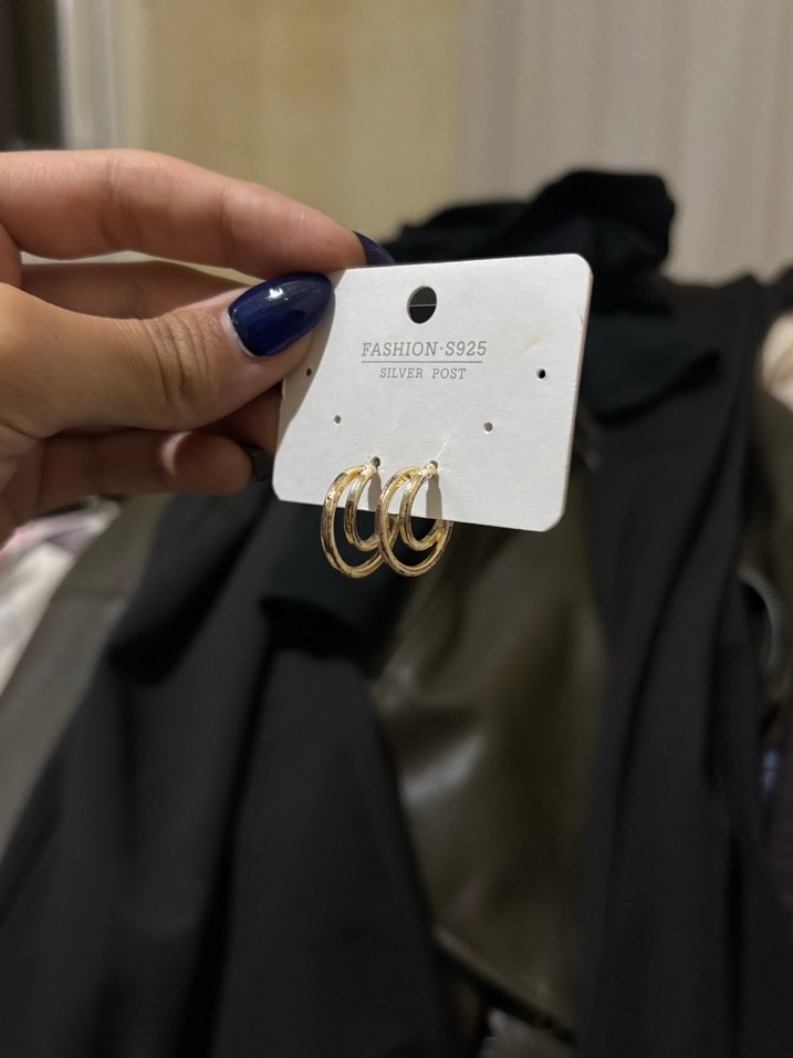 Altın renkli mini halka küpeler, baskılı desene ve cırt cırt kapanışa sahiptir. Günlük sokak stili için minimalist tasarım sunar. FASHION-S925 ve STVERPOST işaretlidir. ✨