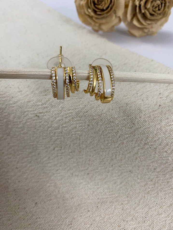 Altın renkli mini küpeler, işlemeli ve payet detaylı çağdaş tasarıma sahiptir. Düğünler için klasik ve zarif bir görünüm sunar.