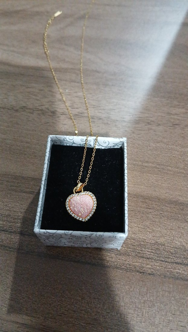 Altın renkli kısa mini kolye, pul işlemeli kalp figürü ve pastel pembe desenli, romantik akşamlar için ideal.