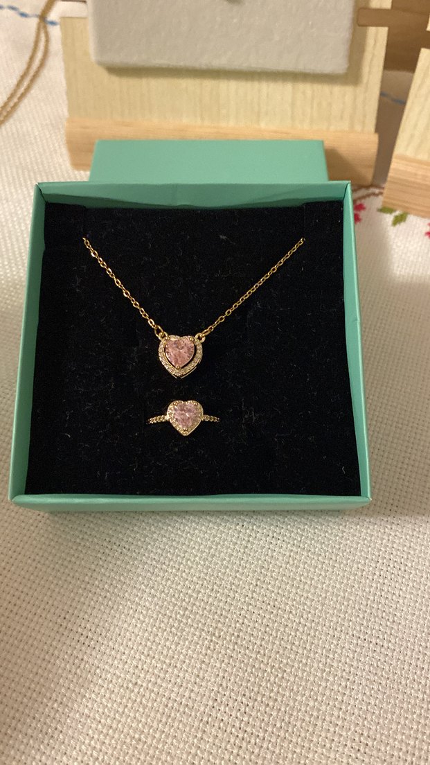 Altın renkli, kısa uzunlukta bohem tarzda, payetli pastel kalp figürlü kolye ve yüzük seti, romantik akşamlar için uygun.