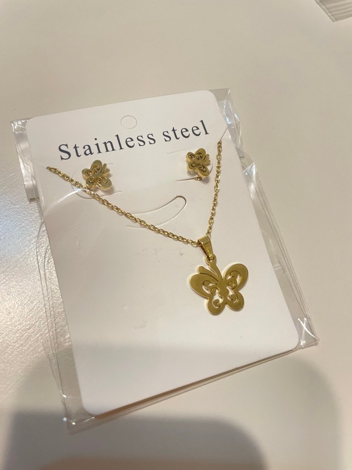 Parlak altın renk paslanmaz çelikten kısa zincirli kelebek kolye ve küpe seti, günlük minimalist sokak tarzı için uygun.