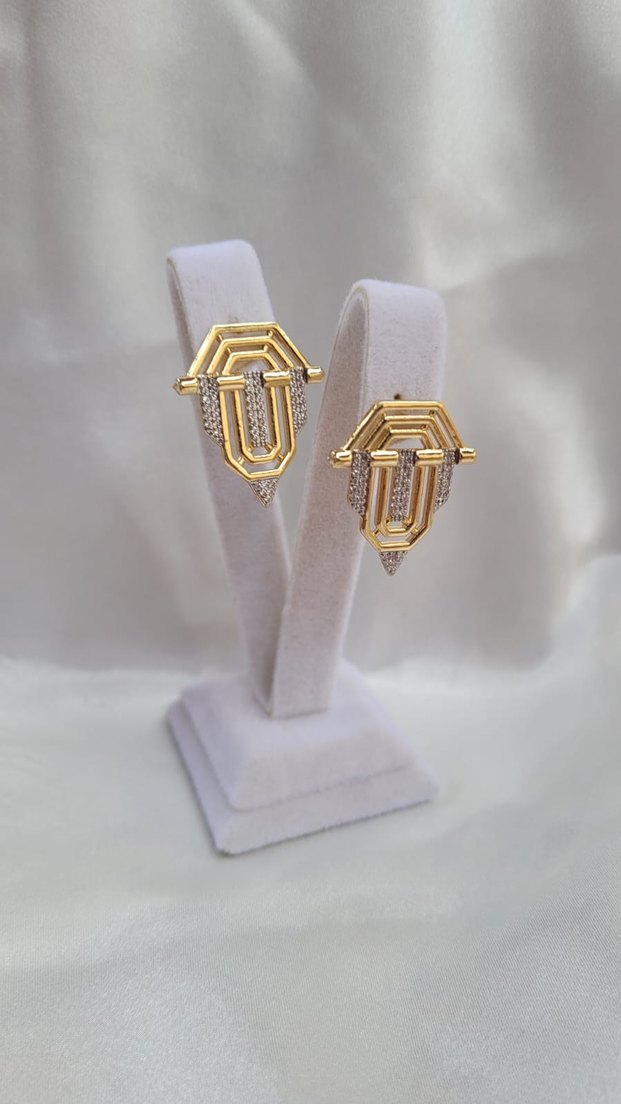 Altın renkli, parlak ve tokalı mini küpeler. İşlemeli desene sahip çağdaş tasarım, düğün ve şık etkinlikler için uygun. Kısa uzunlukta klasik zarafet sunar.