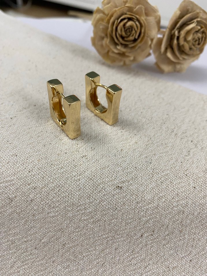 Parlak altın renkli, modern dikdörtgen tasarımlı mini küpeler. Minimalist ve zahmetsiz şıklık sunar, günlük kullanım için klasik zarafet sağlar. ✨