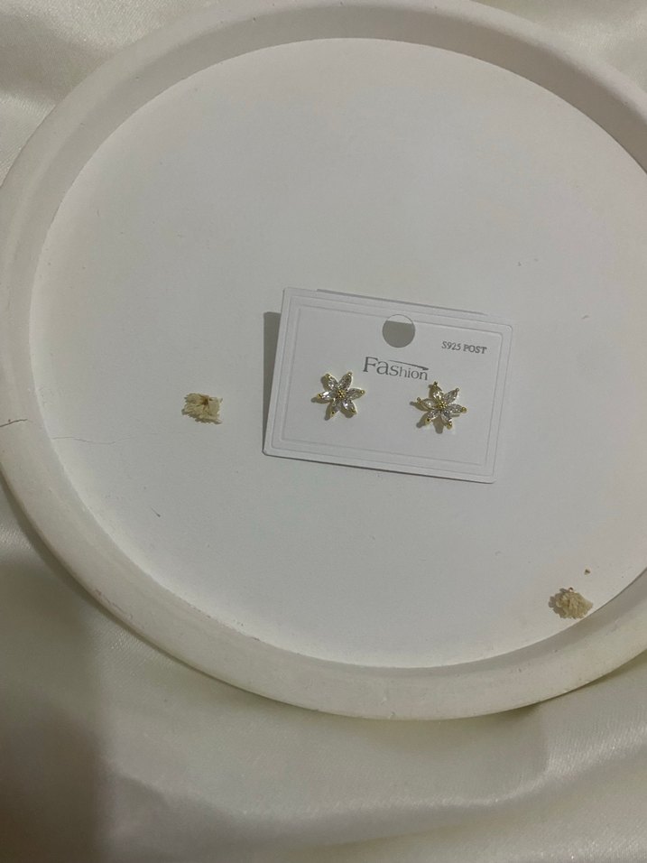 Altın renkli, payet işlemeli mini çiçek desenli küpeler, günlük sokak stiline uygun minimal tasarım.