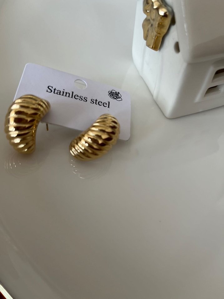 Paslanmaz çelikten, pilili yılan desenli parlak altın renk mini küpeler. Günlük sokak stili için minimalist tasarım.