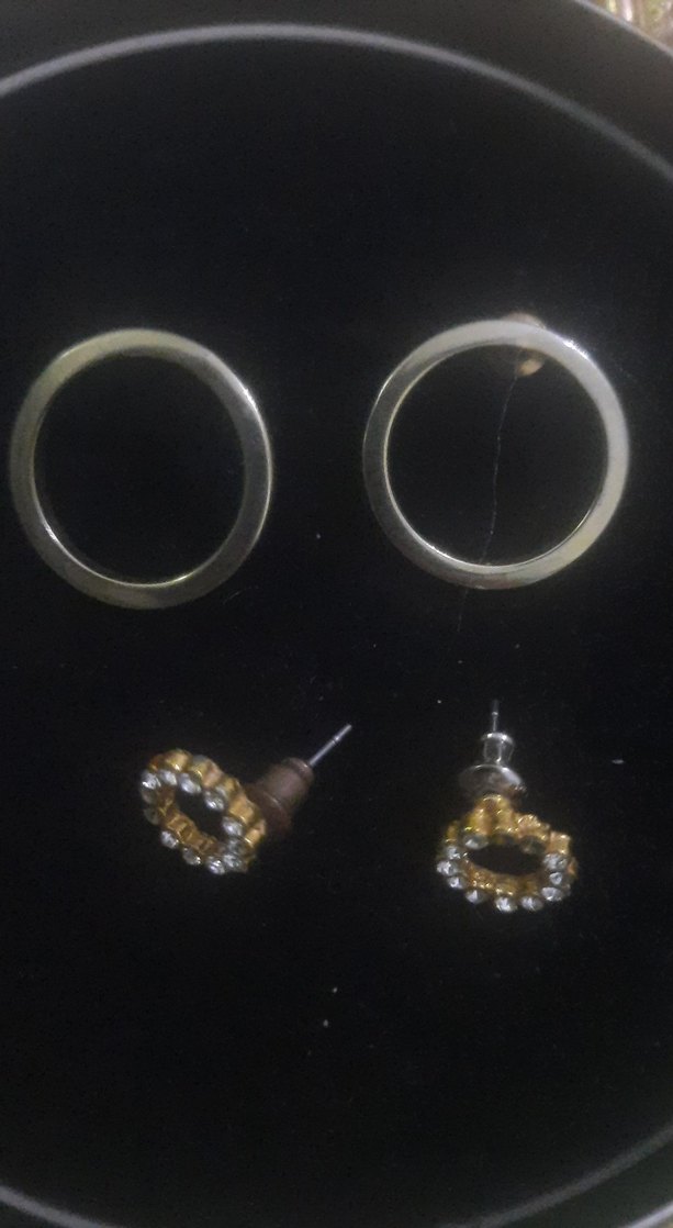 Altın renk mini halka küpeler ve parlak taşlı küçük saplama küpelerden oluşan vintage rock punk tarzında set. Taşlı olanların ikişer taşı düşük digrleri duz gold .kısa ve şık. ikisi toplam fiyat.