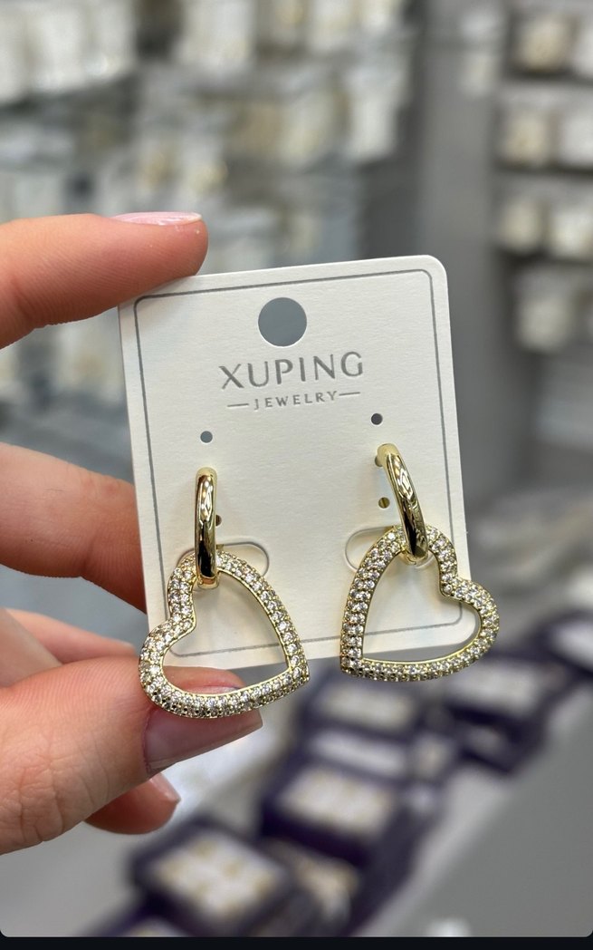 Xuping Jewelry markalı, altın renkli mini kalp şeklinde, taşlarla süslü küpeler. Düğün ve özel günler için modern klasik tarzda, göz alıcı tasarım.