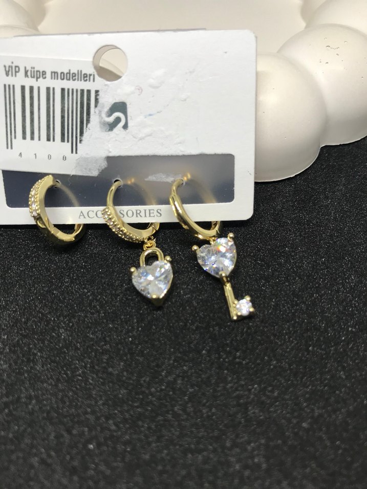 Altın renkli mini küpeler, kalp ve anahtar figürlü taşlı detaylara sahip, romantik akşamlar için ideal. #çeliktakı #çelikküpe #küpe #küpeseti