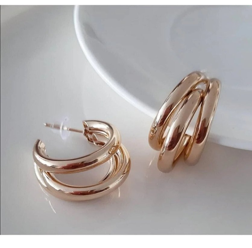 Parlak altın renkli mini üçlü boru halka küpee hiç kullanılmadı göründüğü gibi (hediyeli)