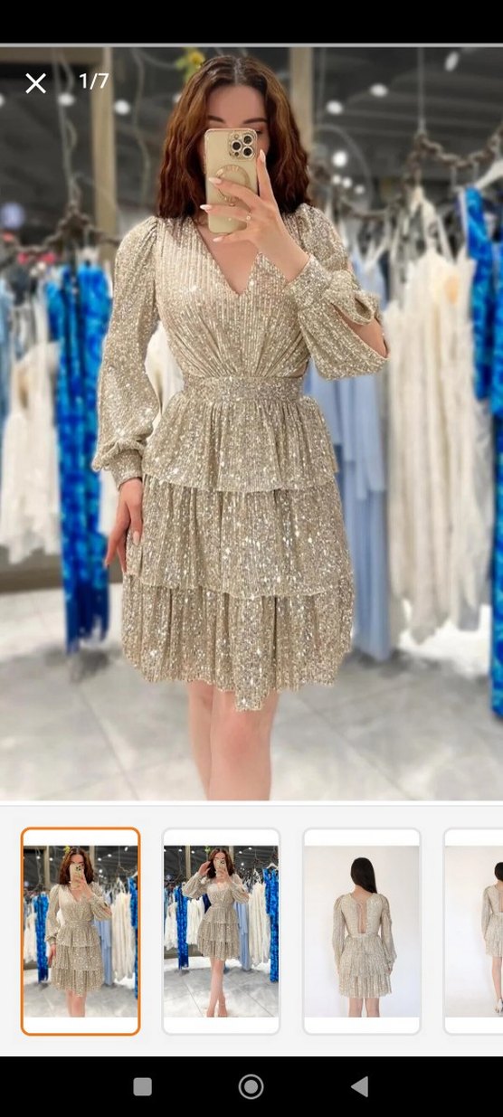 Altın renk, V yaka ve uzun kollu, nakışlı desenlere ve fırfırlı katmanlara sahip bol kesim mini gece elbisesi, şık parti tarzı için uygundur. ✨temiz sadece bir defa giyildi