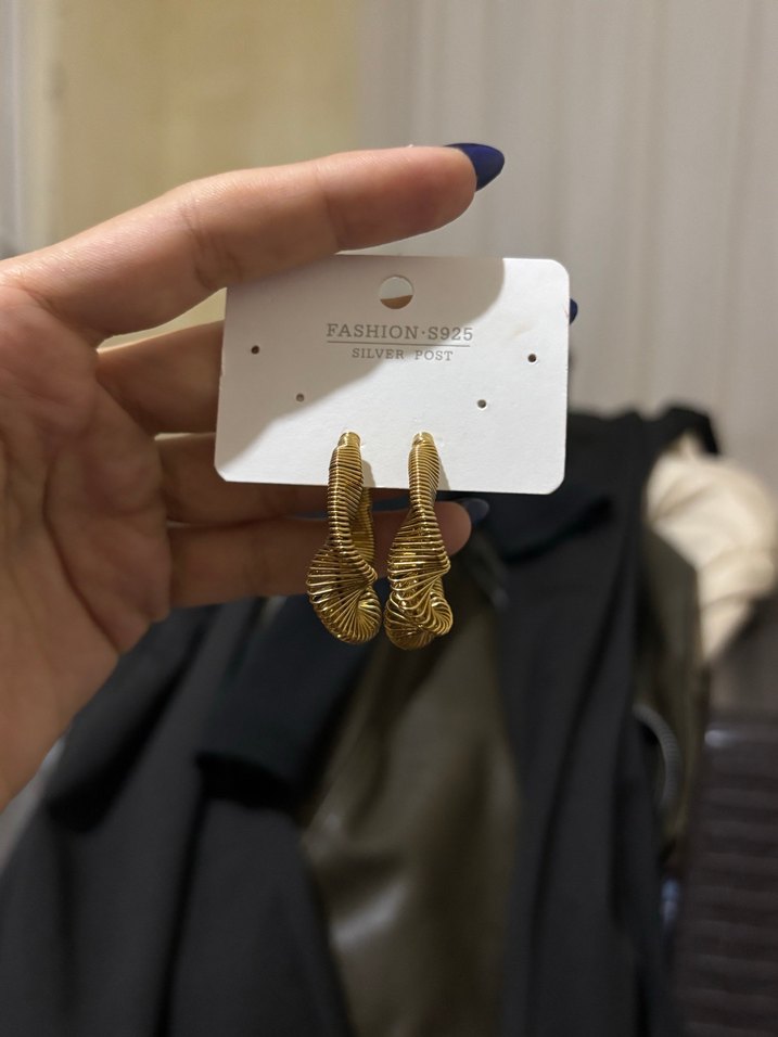Parlak altın renkli, kısa uzunlukta, yılan desenli ve tokalı küpeler. Günlük sokak modasına uygun. Üzerinde 'FASHION-S' yazısı var.