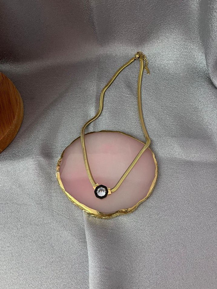 Altın renkli kısa zincir kolye, yılan deseni detaylı ve küçük siyah bir ucu taşıyor, minimalist ve çağdaş tarzda klasik zarafet sunuyor.