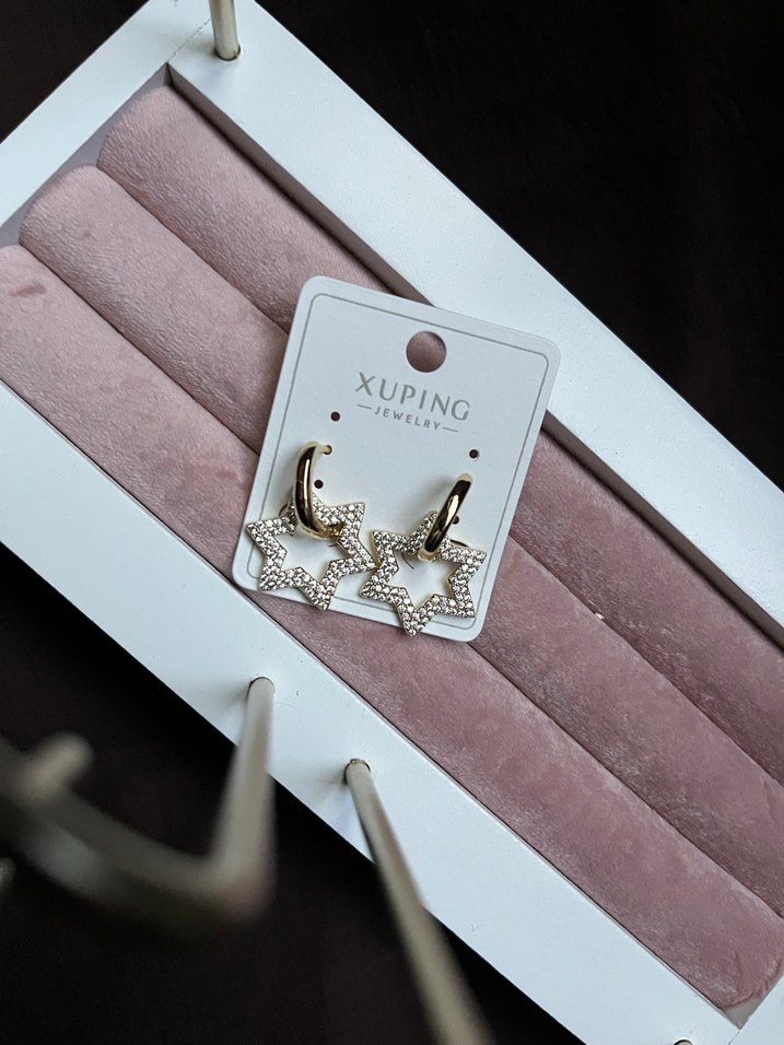 Xuping markalı altın renkli, mini uzunlukta, payet işlemeli yıldız şeklinde küpeler. Düğün ve trend günlük kombinlere uygundur. ✨