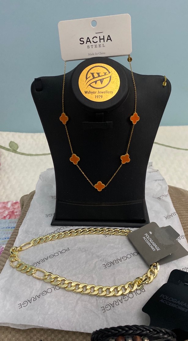 Günlük kullanım için minimalist bohem tarzda, altın renkli kısa zincir kolye. Baskılı yonca desenleri ve çelik malzeme içerir. Orjinal POLO GARAGE etiketli hediyelik kolyeler ve deri metal bileklik …..Fiyat soralım