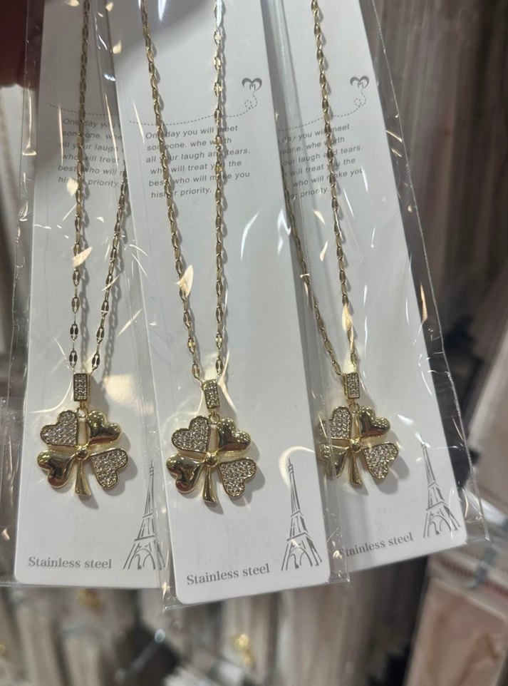 Paslanmaz çelikten yapılmış, işlemeli yonca detaylı kısa altın renkli zincir kolye, günlük kullanım için uygundur.