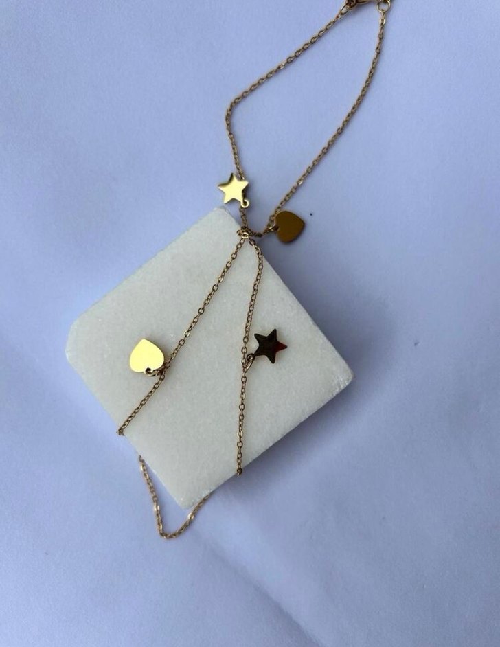 Altın renkli kısa kolye, ince zincir üzerinde küçük yıldız ve kalp figürleriyle minimalist ve bohem tarzı yansıtıyor.