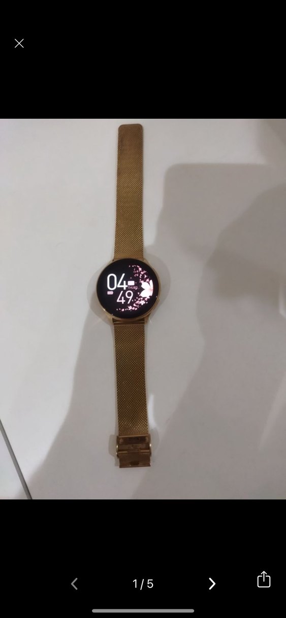 Altın renkli bel kemerli kayışı ve koyu minimalist kadranı ile akıllı saati. Dijital saat gösterimi bulunur, trend günlük ve sokak modasına uygundur. ⌚