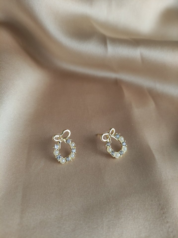 Altın renkli, fiyonk ve ince inci detaylı, minimal tasarımlı küpeler. Düğünler için modern klasik şıklık sunar. ✨