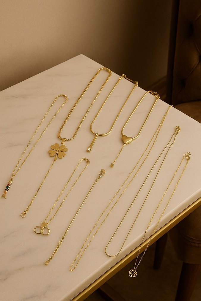 Altın renkli, midi uzunlukta, minimalist tasarımlı ve zincir detaylı kolyeler. Günlük kullanım için bohem tarzıyla uyumlu.