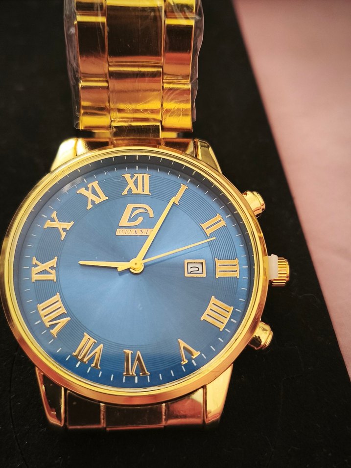 Parlak altın metal kayışlı erkek saati, mavi kadran ve Roma rakamları ile tarih göstergesi içerir. Modern klasik tarzda. Ürünlerimiz %100 yerli üretimdir ve kelepçelidir. ✅ Hiçbir yerde bulunmayan saatler ile tarzınızı ortaya koyun.