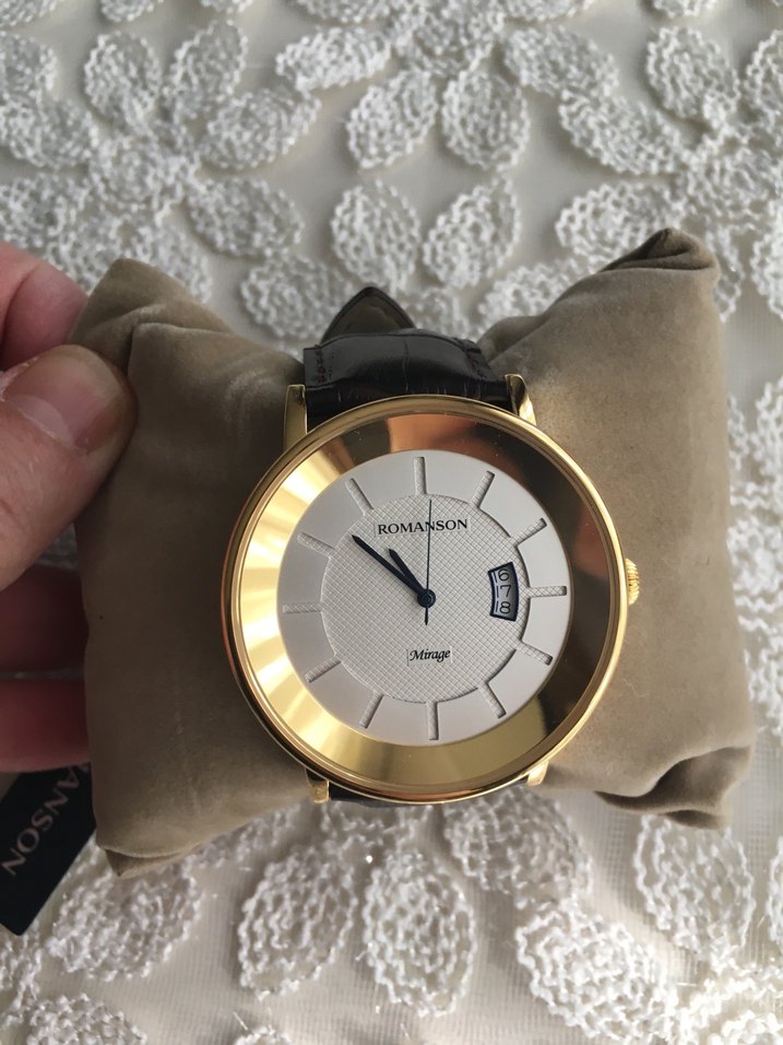 Altın renk kasalı, gri kadranlı ve tarih göstergeli modern klasik tarzda Romanson erkek saati. Deri kayışlıdır. ⌚
