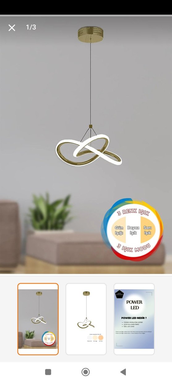 Altın renkli modern tasarımlı LED sarkıt lamba, üç renk ışık ve üç ışık modu sunar. POWER LED teknolojisi ile enerji tasarrufludur.