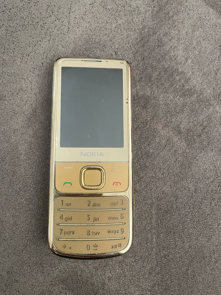 Altın renkli Nokia telefon, klasik tuş takımı ve küçük ekrana sahip. Arama ve bitirme tuşları mevcut. Herhangi bi sorunu yok kutusu mevcut ,imei çalınmasından dolayı iade kabul etmiyorum