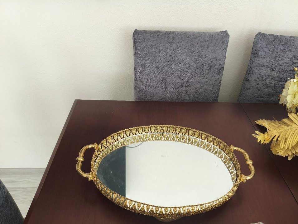 Detaylı desenlere sahip altın renk çerçeveli oval dekoratif ayna tepsi, taşıma kulpları ile kolay kullanım sağlar.