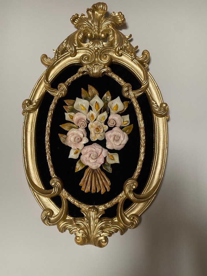Koyu altın renkli oyma detaylı oval çerçevede çiçek buketi yer alır, vintage bir hava katar.