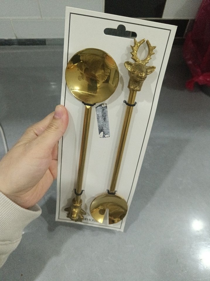 Parlak altın renkte, geyik başı detaylı saplara sahip çatal ve kaşıktan oluşan bir servis takımı.