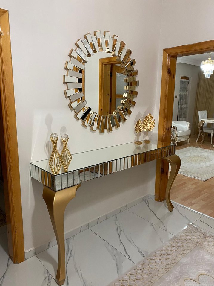 Parlak altın renkte dekoratif çerçeveli ayna, her odaya şıklık katmak için ideal. Eşsiz tasarımı iç mekan stilini güçlendirir. ✨